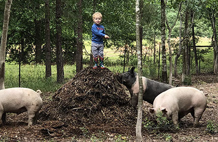 None of our animals spend their lives confined in overcrowded, restrictive, concrete floored structures. Chickens were created to scratch at the earth, foraging for greens and bugs, so they free-range on our 2+ acre pasture. Pigs were created to dig and root in the earth, eating roots, bugs, and greens, so our pigs enjoy their 1/5 acre paddock where they can dig and wallow in dirt to their hearts' content. Cows were created to eat fresh grass, not grain, so they will enjoy fresh pasture everyday.